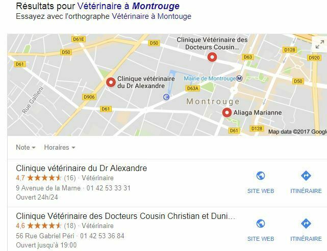 On voit immédiatement que plusieurs cabinets ressortent lors de la recherche relativement simple qui ne contient que 2 mots clés : Vétérinaire Montrouge.